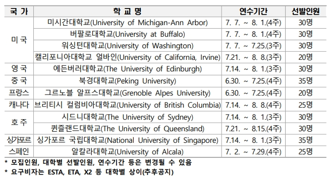 각 대학별로 20~35명 내외를 선발하며, 연수기간은 3주~4주(약 한 달 이내)로 대학별로 상이합니다.